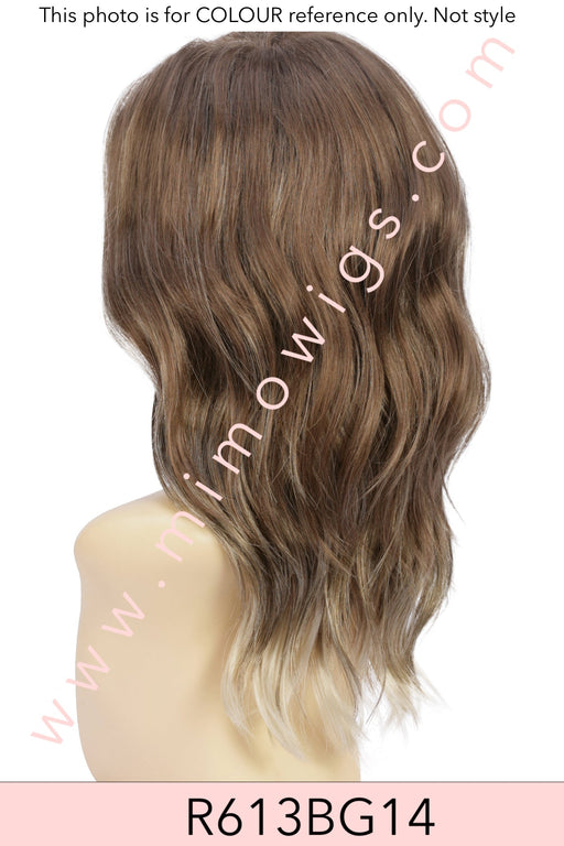 Estetica-DesignsMONOFILAMENTLACE FRONT ••• Medium Length Blunt Cut Lob COLOUR SHOWN: SILVERSUNRT8 & Caramel Kiss RT4 BANG - 13"SIDE - 9.5"CROWN - 14"NAP...