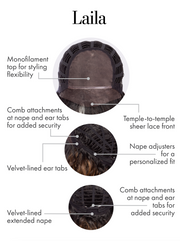 Cap Construction: Lace Front, Monofilament Top, Velvet lined ear tabs, Extended Nape, Comb Attachments at nape and ear tabs